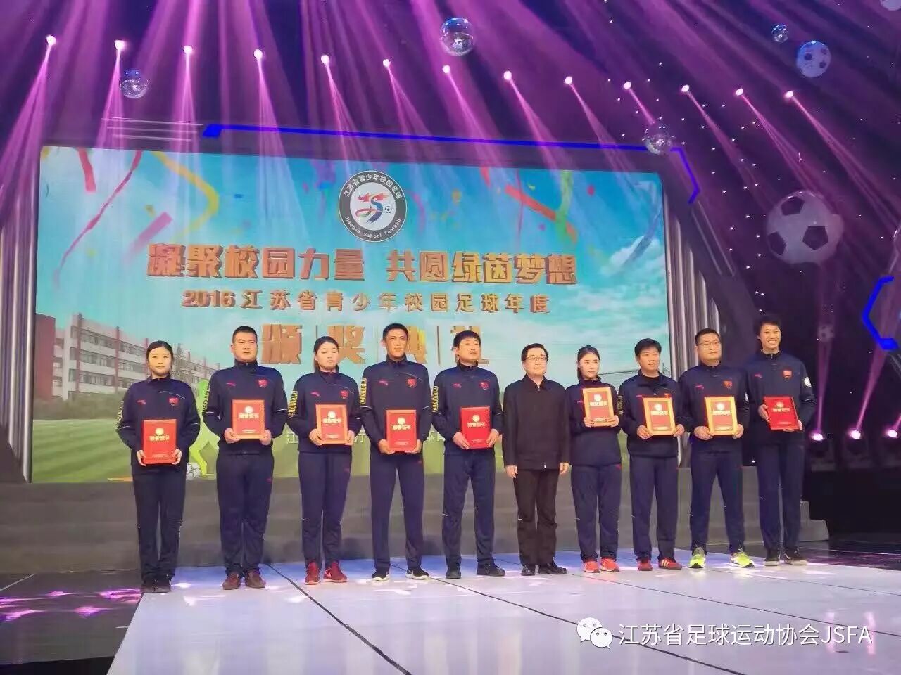 1月7日,全省青少年校园足球工作颁奖典礼在宁隆重举行。省政府办公厅主任、省足球运动协会主席谢润盛为微课比赛一等奖获奖老师颁奖。 为进一步深化足球课堂教学改革,提升体育教师足球教学水平,2016年我省开展了“江苏省中小学体育教师足球微课教学评比”活动。共有28名体育教师从足球微课教学录像课评比中脱颖而出,并分别进行了现场教学比赛。