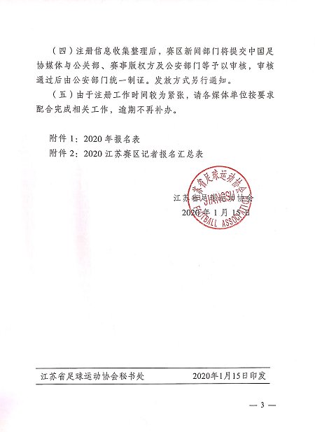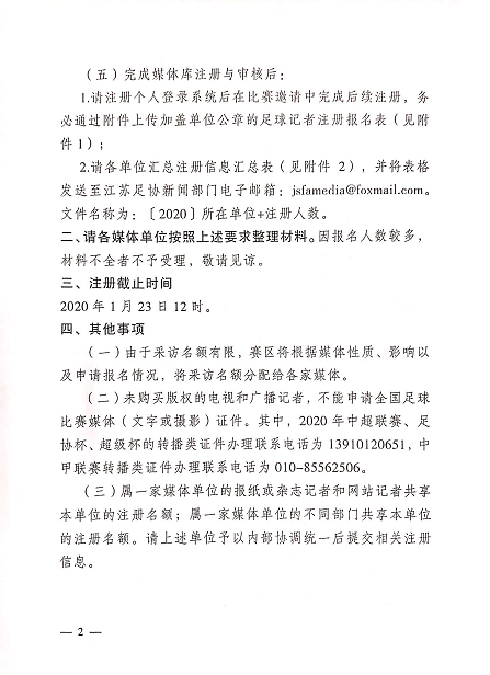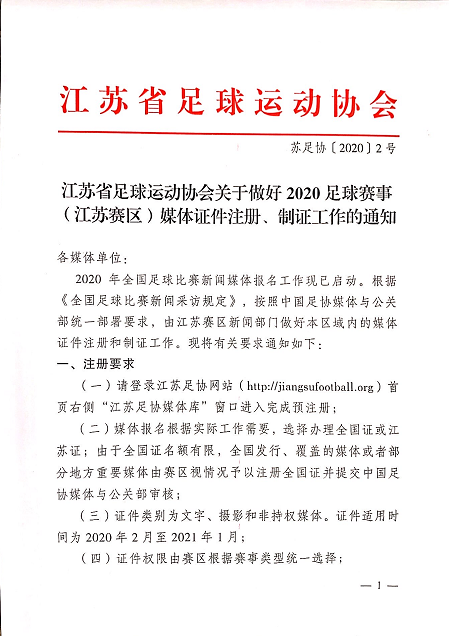 江苏省足球运动协会关于做好2020足球赛事(江苏赛区)媒体证件注册、制证工作的通知