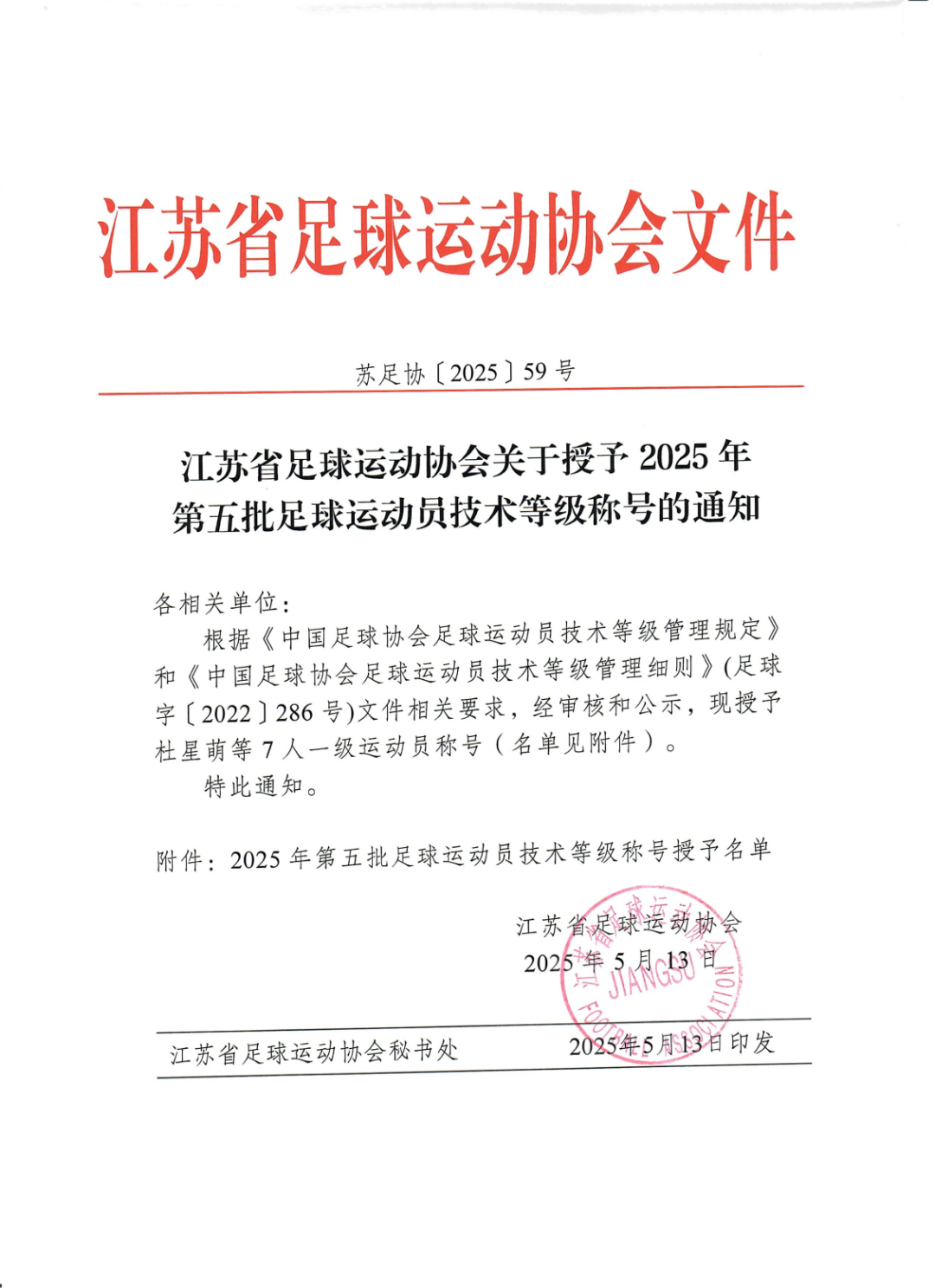 上一篇:江苏省足球运动协会关于授予2025年第四期足球运动员技术等级称号的通知