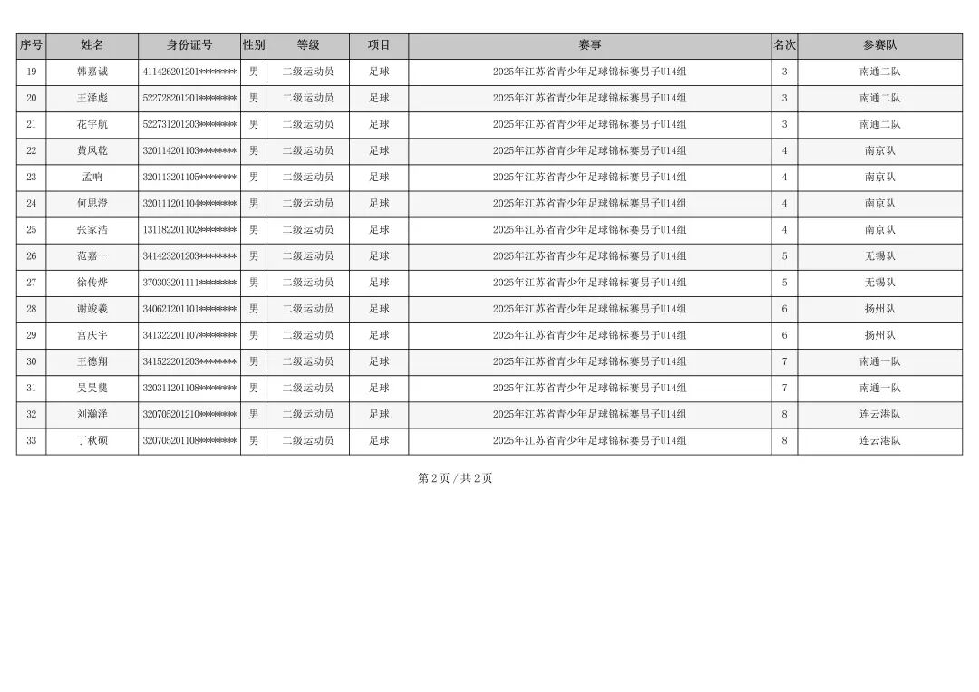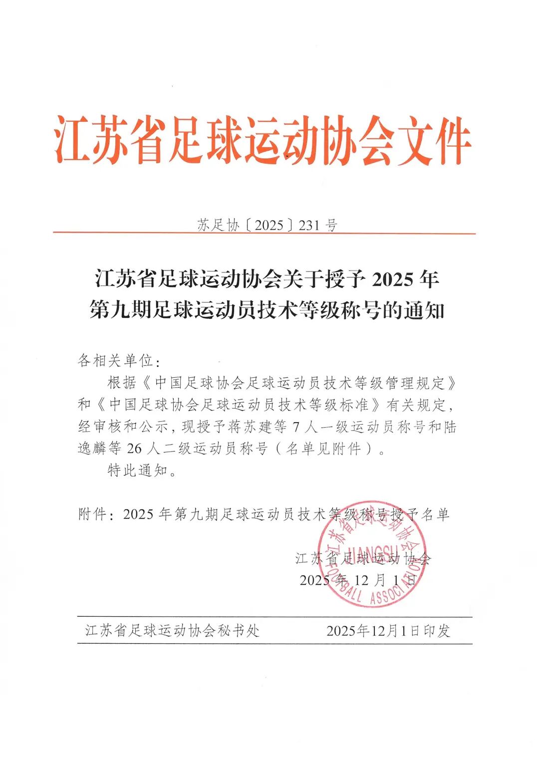 江苏省足球运动协会关于授予2025年第九期足球运动员技术等级称号的通知