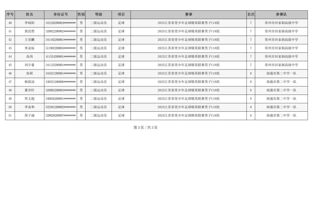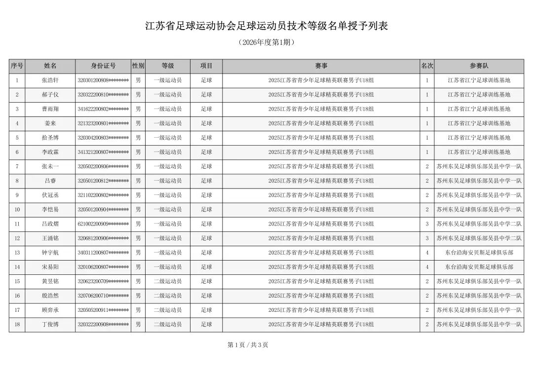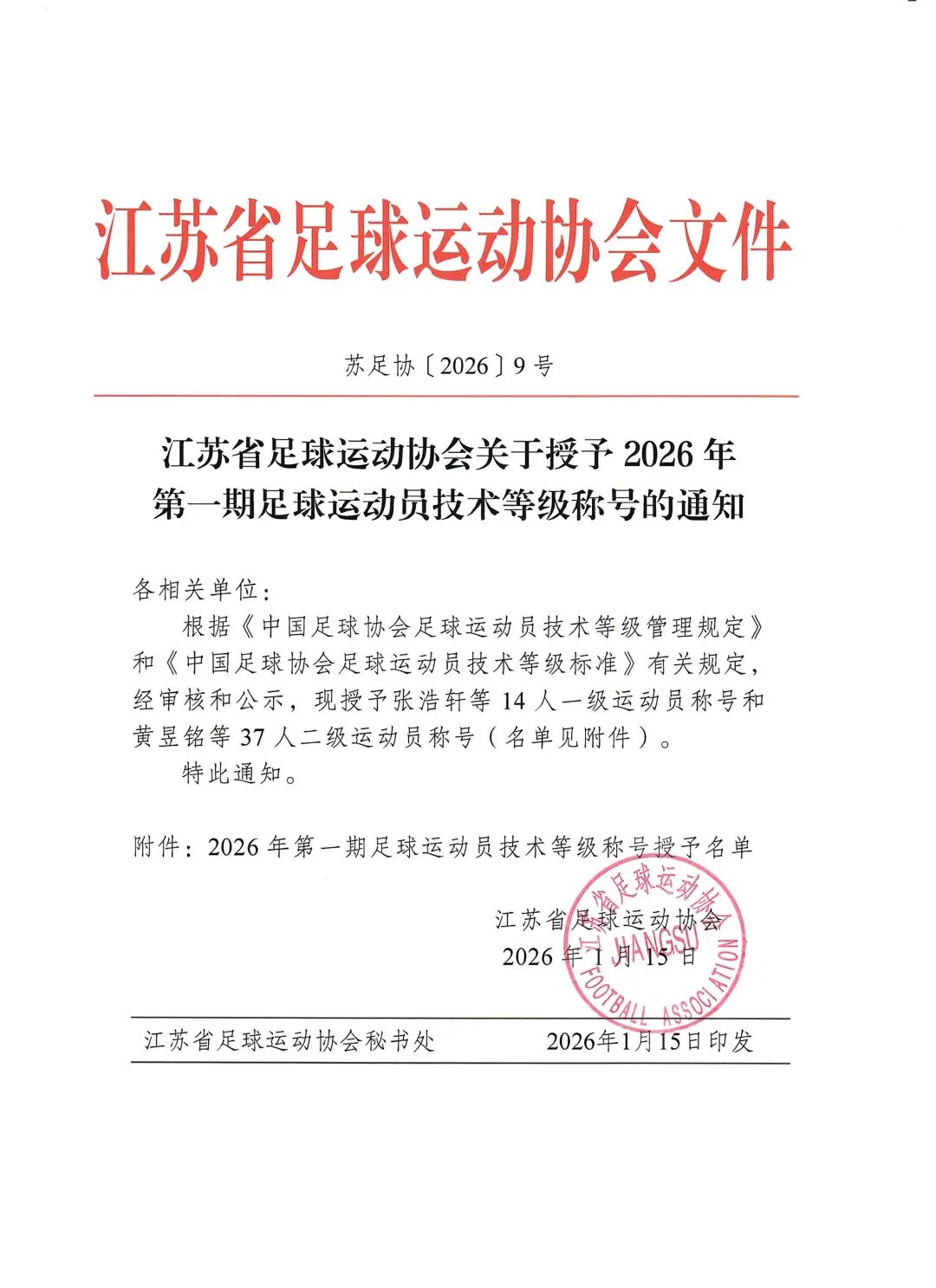 江苏省足球运动协会关于授予2026年第一期足球运动员技术等级称号的通知
